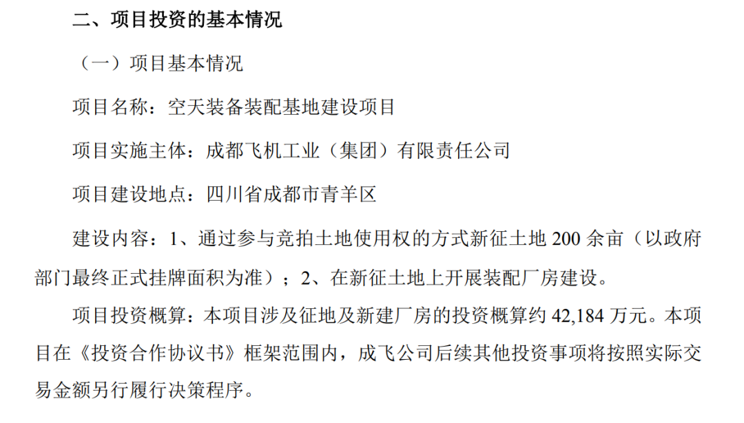 12月16日晚,中航成飞发布公告,为进一步推动公司持续高质量发展,增强空天装备装配能力,公司全资子公司成都飞机工业(集团)有限责任公司拟实施空天装备装配基地建设项目建设,新征机场周边工业用地200余亩(以正式挂牌面积为准),并建设空天装备装配厂房,形成空天装备装配基本条件。本项目涉及征地及新建厂房的投资概算约4.22亿元。