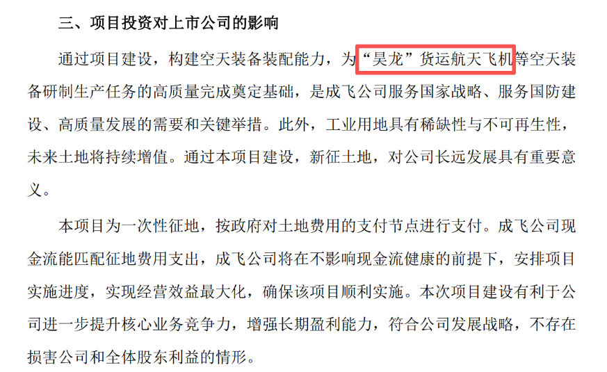 中航成飞表示,通过项目建设,公司将构建空天装备装配能力,为“昊龙”货运航天飞机等空天装备研制生产任务的高质量完成奠定基础,是成飞公司服务国家战略、服务国防建设、高质量发展的需要和关键举措。此外,工业用地具有稀缺性与不可再生性,未来土地将持续增值。通过本项目建设,新征土地,对公司长远发展具有重要意义。