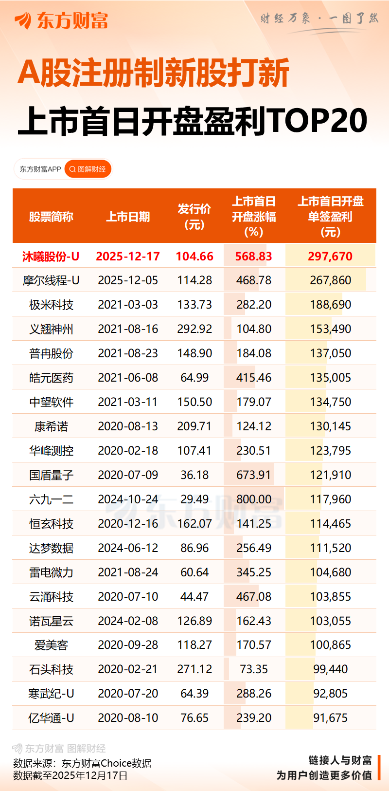 沐曦股份今日上市,开盘上涨568.8%,报700元,总市值超2800亿,中一签获利超29.7万。