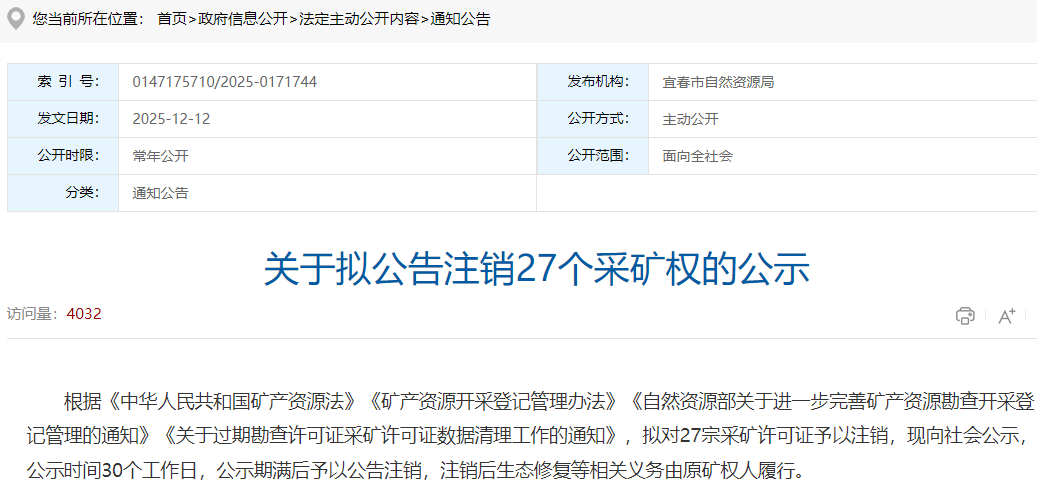 此次狮子岭矿区采矿权拟注销,是当地自然资源部门依据矿产资源相关法规开展的集中清理工作,27个采矿权一同被列入拟注销名单。期货日报记者查询宜春市自然资源局发布的《公示》获悉,根据《中华人民共和国矿产资源法》《矿产资源开采登记管理办法》和《自然资源部关于进一步完善矿产资源勘查开采登记管理的通知》等相关要求,拟对高安市伍桥瓷石矿等27宗采矿许可证予以注销。目前,宜春市自然资源局已对拟注销的27宗采矿许可证进行公示,公示期(30个工作日)满后予以公告注销。注销后,生态修复等相关义务由原矿权人履行。