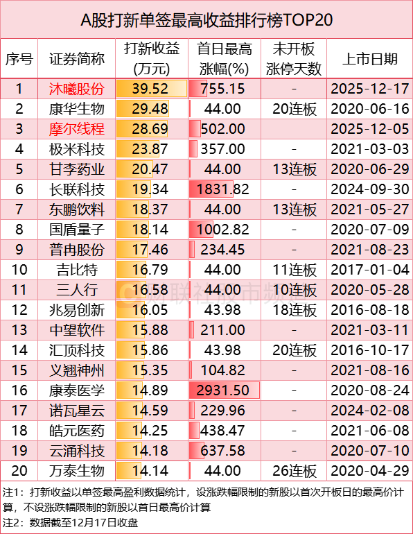 今日,沐曦股份正式登陆科创板,成为继摩尔线程后又一家上市的国产GPU龙头。首日上市,公司股价一路狂奔,收盘时涨幅高达692.95%,按单签500股计算,打新投资者首日盈利规模近36.26万元。若以盘中755.15%的最大涨幅测算,沐曦股份单签最大盈利达39.52万元。这两项数据不仅双双超越近期“大肉签”摩尔线程,同时也助力沐曦股份登顶A股史上“最赚钱新股”,成为首日单签盈利、单签最大盈利双纪录创造者。除了打新收益惊人外,沐曦股份今日股价也表现强势,收盘报于829.9元,在超过摩尔线程的同时成功跻身A股股价排行榜第三名,仅次于贵州茅台、寒武纪两只千元股,稳稳站在市场高价股头部核心位置。