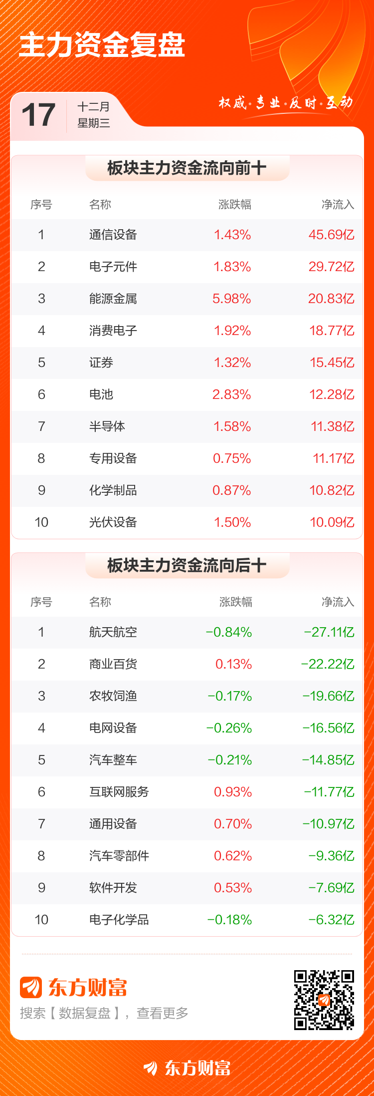 12月17日,沪指涨1.19%,深成指涨2.4%,创业板指涨3.39%。两市成交额1.81万亿,较上个交易日放量870亿。数据显示,今日大盘主力资金净流入25.19亿。通信设备、电子元件、能源金属等板块主力资金流入排名居前,其中通信设备净流入45.69亿元。