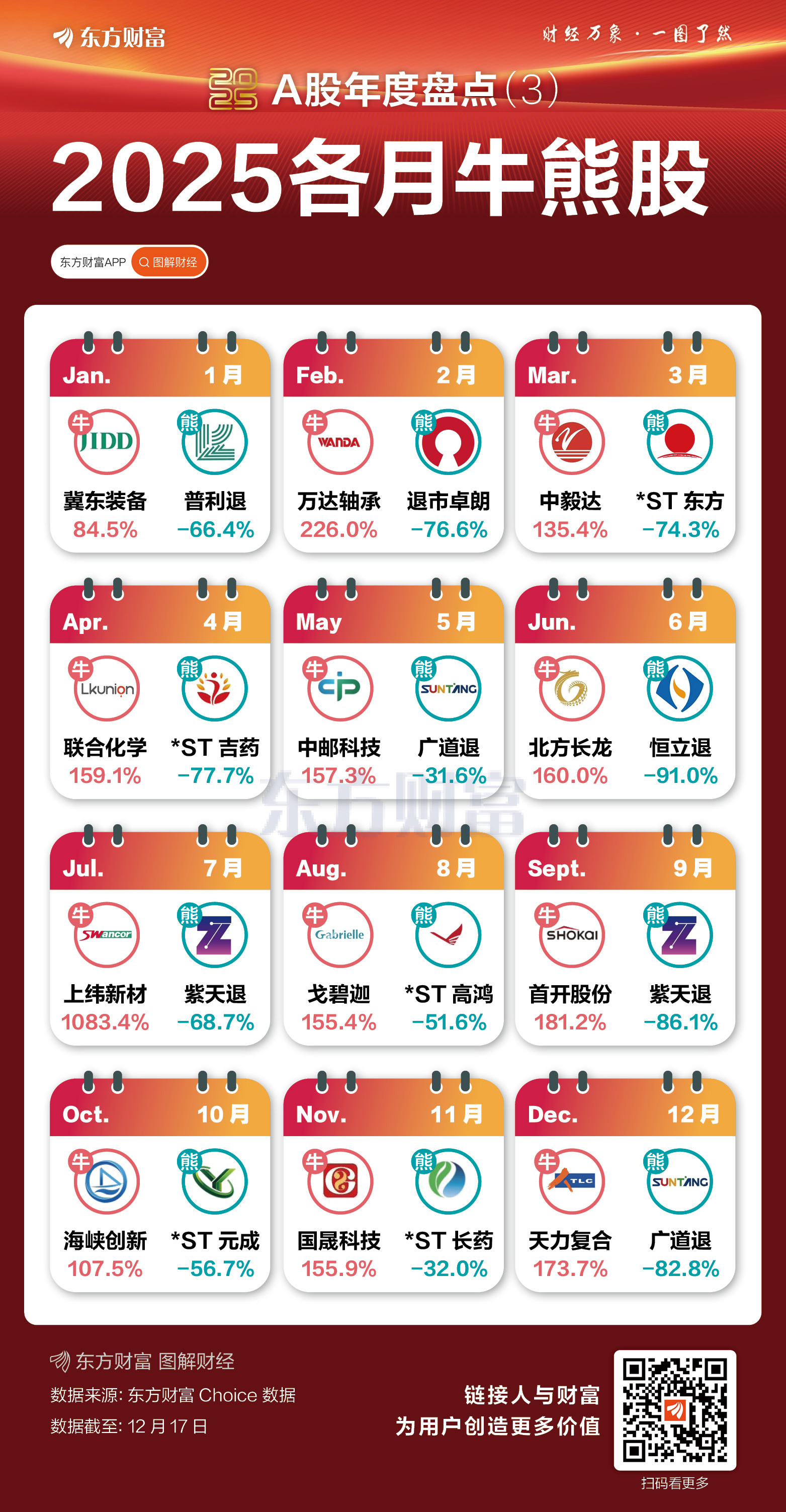 从各月涨幅最大个股来看(剔除年内新股),大体能感受到A股年内行情的演绎路径。比如春晚上宇树机器人跳的《秧BOT》火爆出圈,带动了人形机器人产业链的走强,1月、2月的“涨幅王”冀东装备和万达轴承,均与此密切相关。