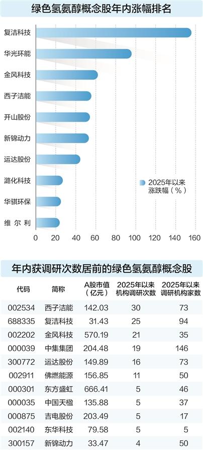 据证券时报·数据宝统计,A股市场上布局绿色氢氨醇相关业务的概念股有17只。截至12月17日,6只概念股年内涨幅超过50%,分别是复洁科技、华光环能、金风科技、西子洁能、开山股份、新锦动力。机构关注度方面,数据宝统计,今年以来机构调研10次以上的绿色氢氨醇概念股有6只,分别为西子洁能、复洁科技、金风科技、中集集团、运达股份、佛燃能源。机构调研次数最多的是西子洁能,年内累计获调研30次。公司曾在投资者互动平台表示,公司在风光氢氨醇一体化模式中,可参与熔盐储能设备及余热炉、换热器的设备供应,公司将不断扩展在绿氨、绿醇产业的应用。