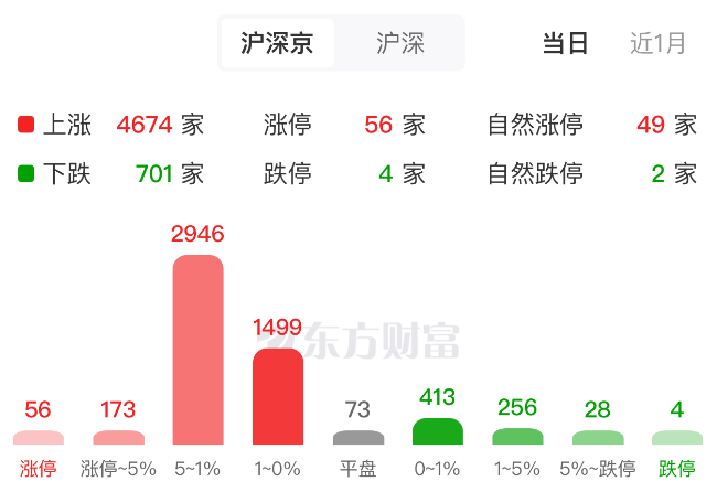 A股三大股指早盘震荡走高,普涨行情再现。截至午间收盘,沪指涨0.59%,深成指涨0.93%,创业板指涨0.99%。量能方面,两市半天成交1.09万亿元,较昨日同期放量约427亿元。全市场共4674股飘红,56股涨停。