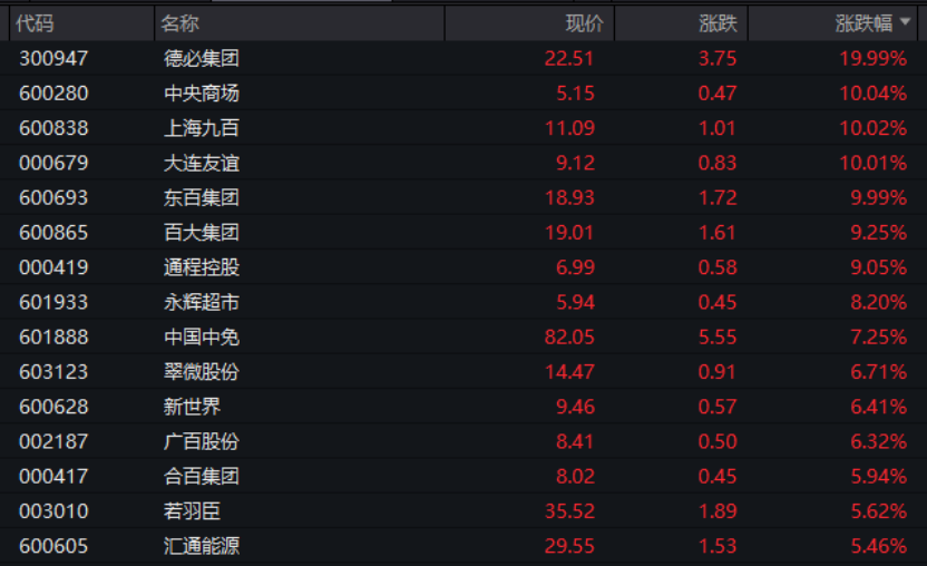 A股市场今天(12月19日)上午整体上行,主要指数不同程度上涨。截至上午收盘,上证指数报3899.31点,上涨0.59%,盘中一度重回3900点之上;其他几个主要指数中,深证成指涨0.93%,创业板指涨0.99%,科创50指数涨0.69%。从行业板块和赛道来看,若按照申万一级行业划分,商贸零售板块大涨,板块盘中涨幅一度接近4%,板块内个股掀起涨停潮。德必集团“20cm”涨停,中央商场、上海九百、大连友谊、东百集团等股票涨停,百大集团涨9.25%,永辉超市涨8.20%。此外,免税店、乳业、新零售等大消费概念亦大幅拉升。创源股份、欢乐家、新诺威等涨超10%,西王食品、红棉股份、庄园牧场、天创时尚、新华都、九牧王等涨停,海汽集团、中国中免、骑士乳业等涨超7%。
