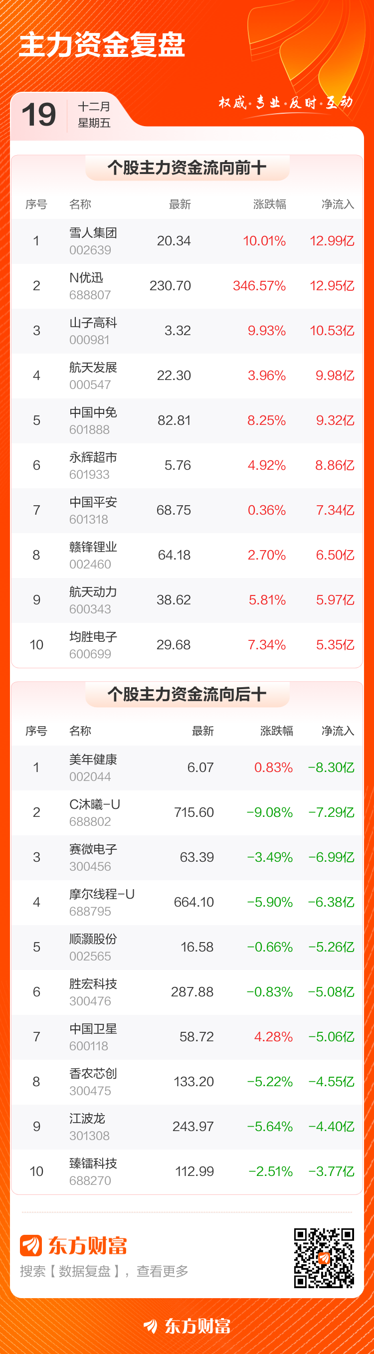主力净买入个股中,雪人集团排名第一,主力净买入12.99亿元,该股今日涨停;N优迅排名第二,主力净买入12.95亿元。