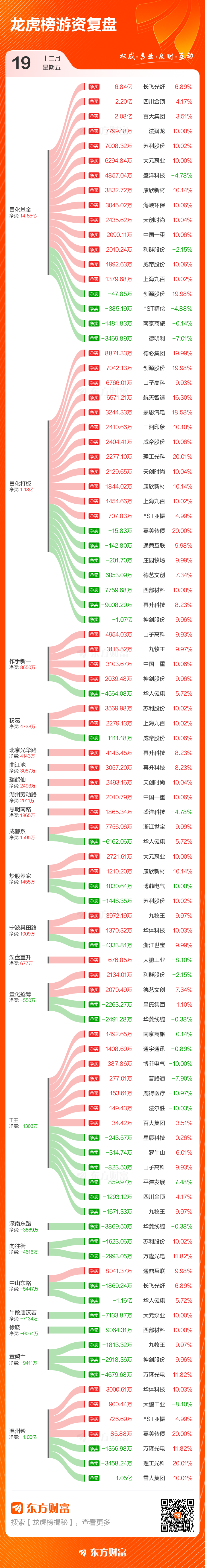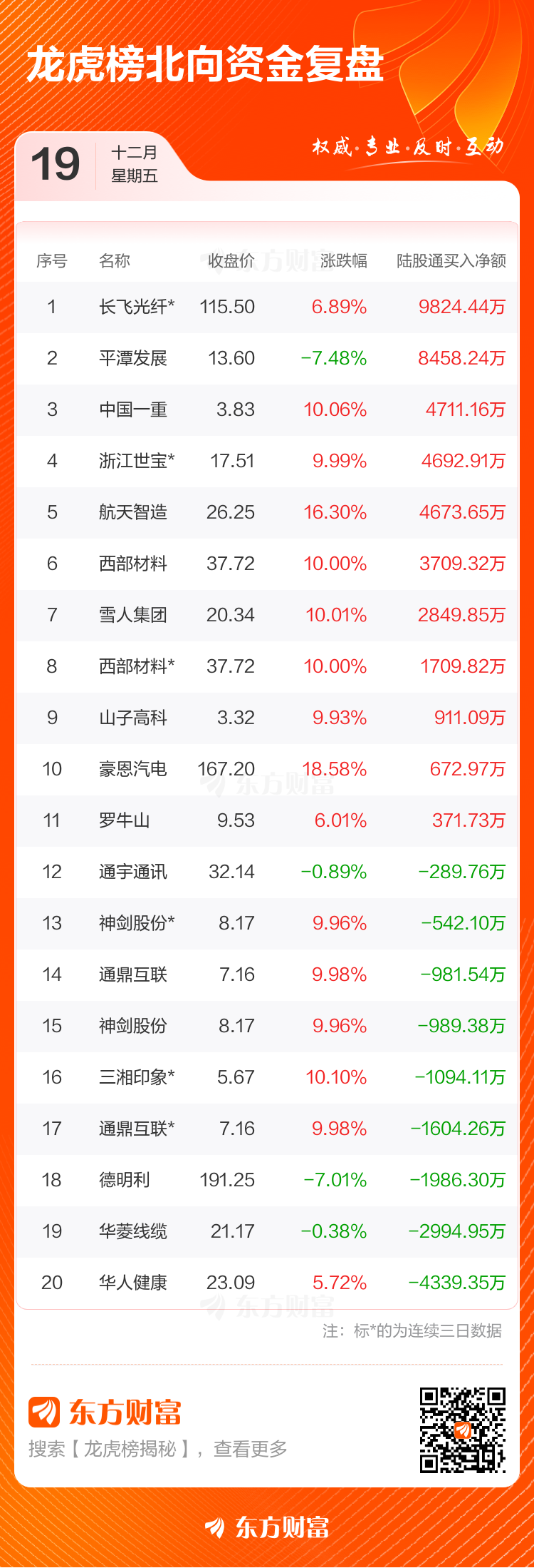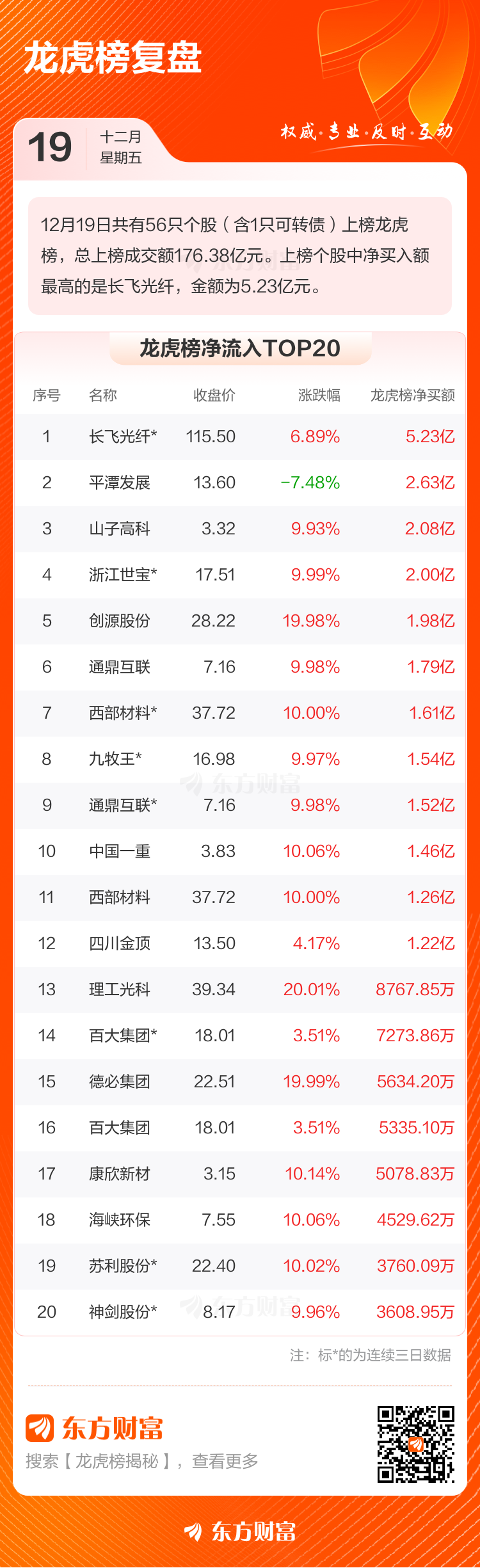 12月19日共有56只个股(含1只可转债)上榜龙虎榜,总上榜成交额176.38亿元。上榜个股中净买入额最高的是长飞光纤,金额为5.23亿元。
