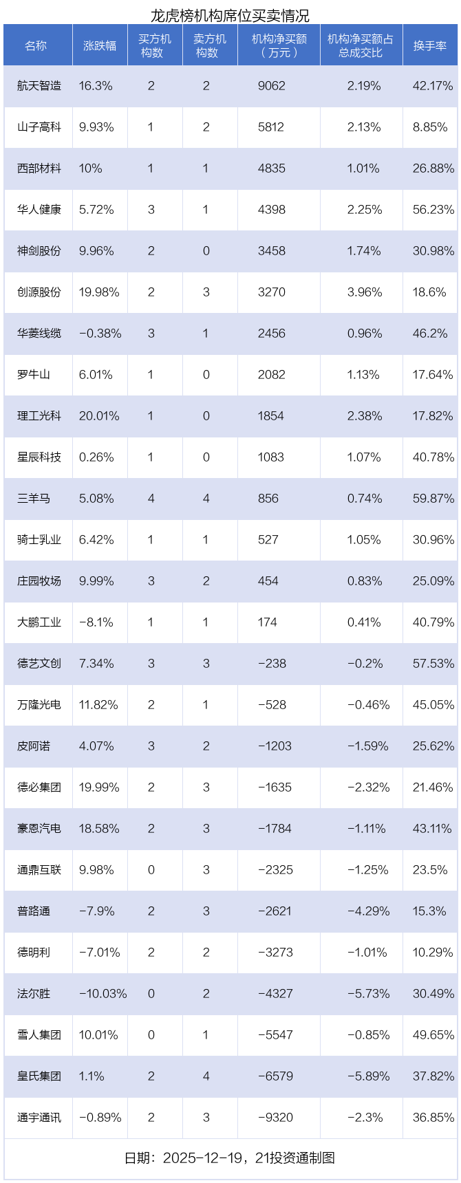 其中,机构净买入金额最多的是航天智造(300446.SZ),当日收盘上涨16.3%,换手率为42.17%。