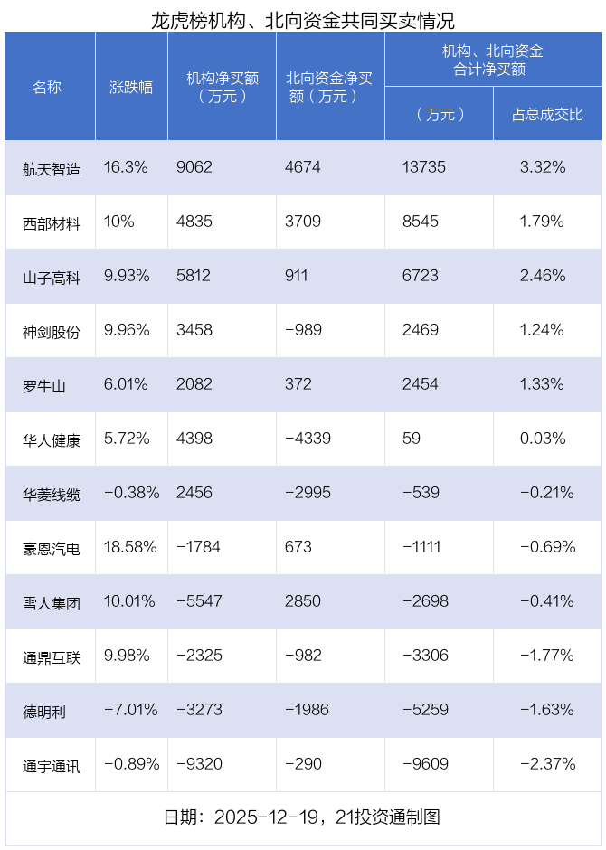 值得注意的是,机构和北向资金共同净买入了航天智造、西部材料、山子高科、罗牛山等4股;共同净卖出了通宇通讯、通鼎互联、德明利等3股;在雪人集团,豪恩汽电,神剑股份,华菱线缆,华人健康上出现分歧。