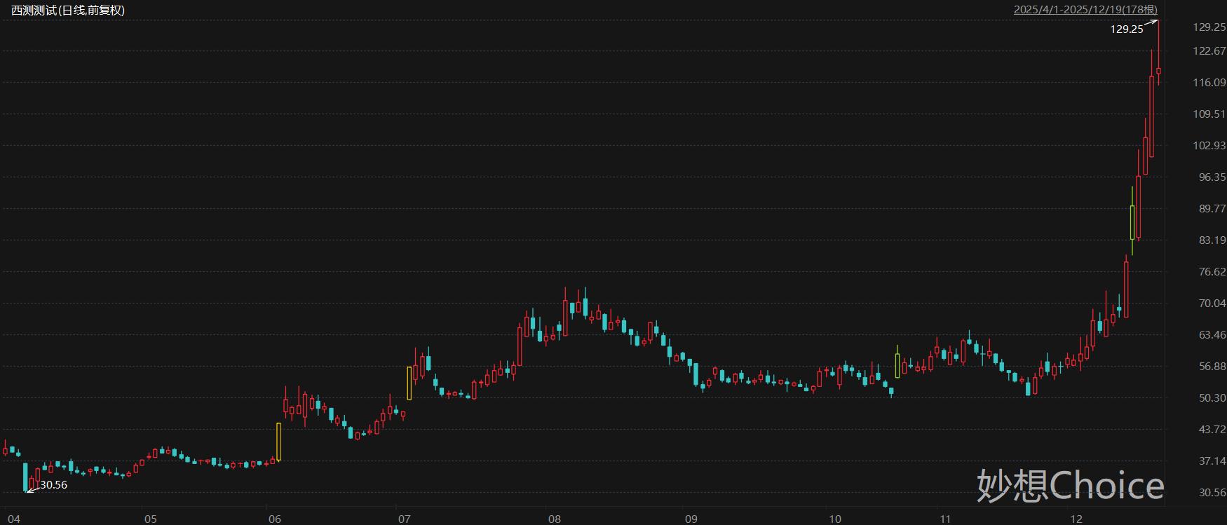 已布局商业航天等新领域检测服务的西测测试周五盘中一度大涨10%,最高触及129.25元/股。西测测试股价自4月低点迄今累计最大涨幅323%。中邮证券分析师鲍学博等人5月20日研报认为,西测测试环境可靠性实验服务能力大幅提升,特别是面向商业航天方面的热真空等实验能力、卫星载荷试验服务能力快速提升,发展势头良好。