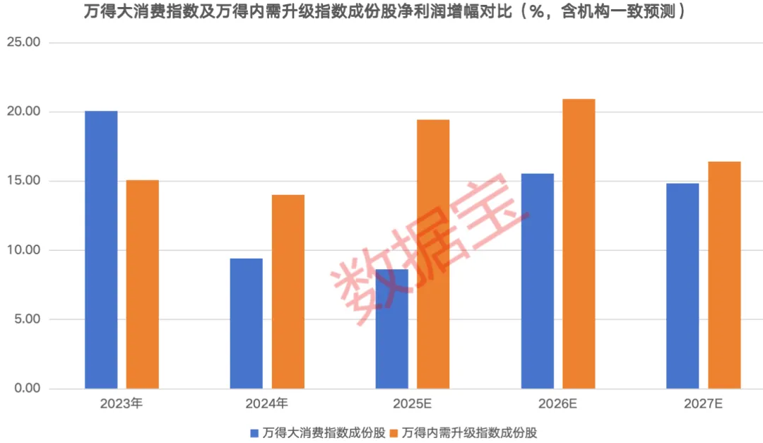 从机构一致预测来看,万得大消费指数成份股及万得内需升级指数成份股2026年、2027年整体净利润增幅均有望保持双位数。具体来看,万得大消费指数成份股2025年全年净利润(取中值)合计近4600亿元,较上一年的净利润增长8.63%,2026年及2027年净利润增幅均有望超过14%;万得内需升级指数成份股2025年至2027年净利润增幅均有望超过15%。