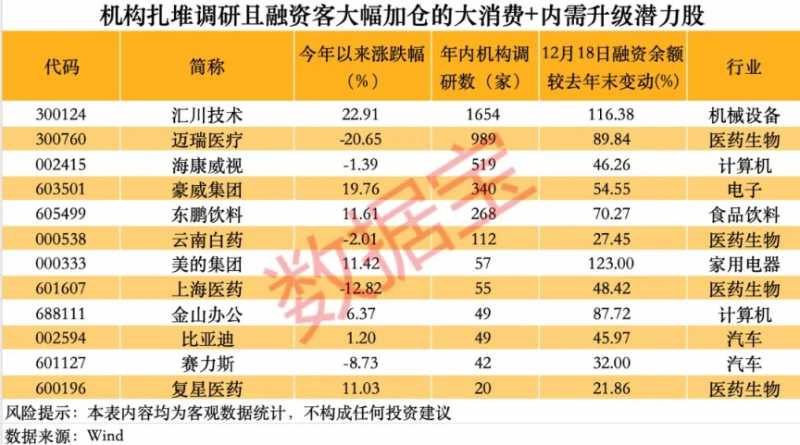 进一步来看,融资余额增幅不低于20%,且年内获得20家及以上机构调研、年内涨幅低于25%(低于87只成份股的平均涨幅)的个股有12只,主要分布于医药生物、食品饮料、家用电器等行业。