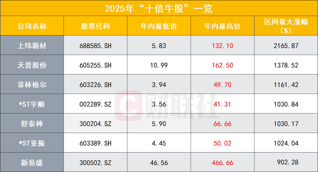 截至目前,2025年的A股市场,“十倍股”并非个例,上纬新材等多只个股也上演了类似的十倍行情。以下为财联社梳理的2025年“十倍牛股”: