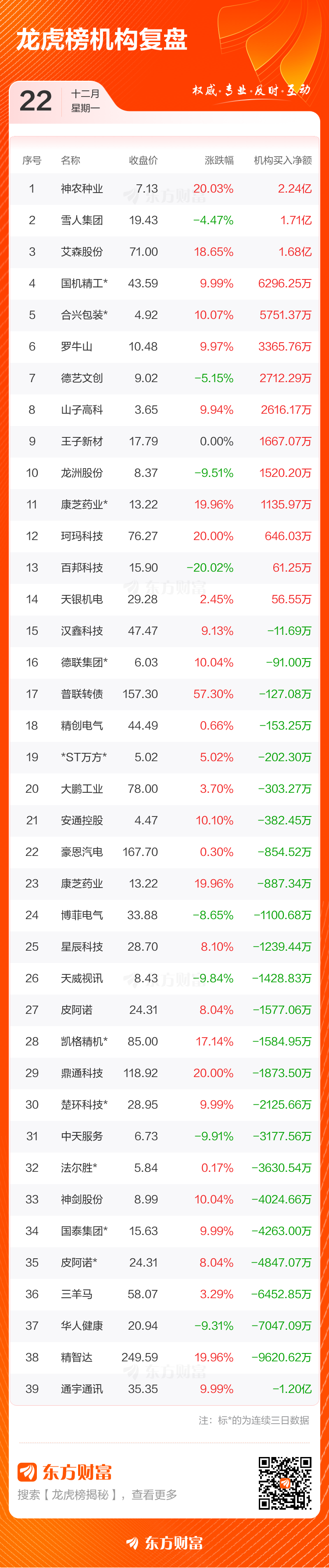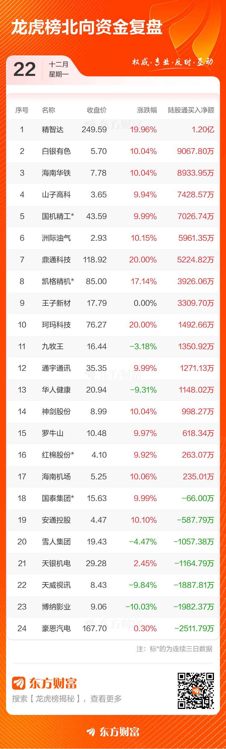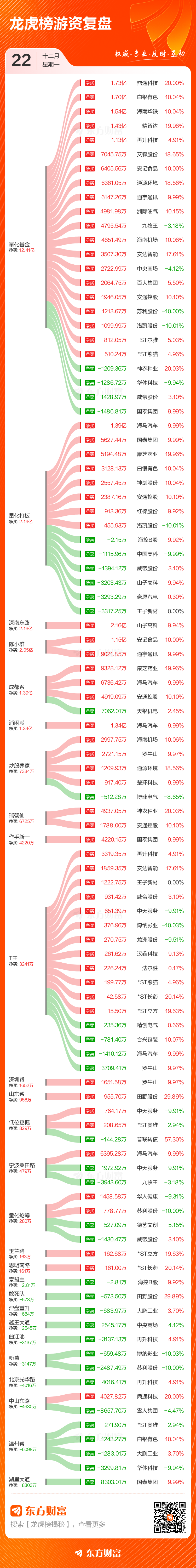 12月22日共有65只个股(含1只可转债)上榜龙虎榜,总上榜成交额163.25亿元。上榜个股中净买入额最高的是山子高科,金额为6.88亿元。