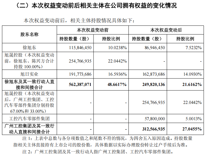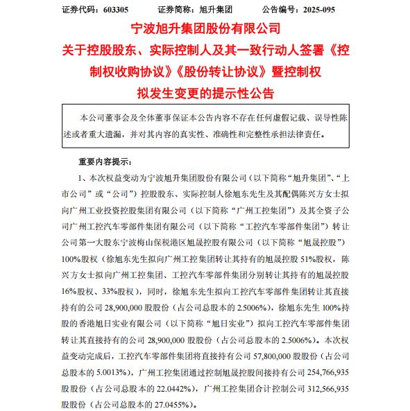 公告显示,本次交易的总对价为42.95亿元。完成本次交易后,广州工控集团及其一致行动人合计控制旭升集团27.0455%的股份,徐旭东及其一致行动人合计控制旭升集团21.6162%的股份。旭升集团公告称,本次权益变动完成后,公司控股股东将由徐旭东变为广州工控集团,实控人将由徐旭东变为广州市人民政府。广州工控集团计划以旭升集团为平台,推动产业强链、延链、补链、扩链,最终构建“链主企业+属地化配套”的闭环产业生态,完善广州工控集团在新能源汽车领域的全链条布局。