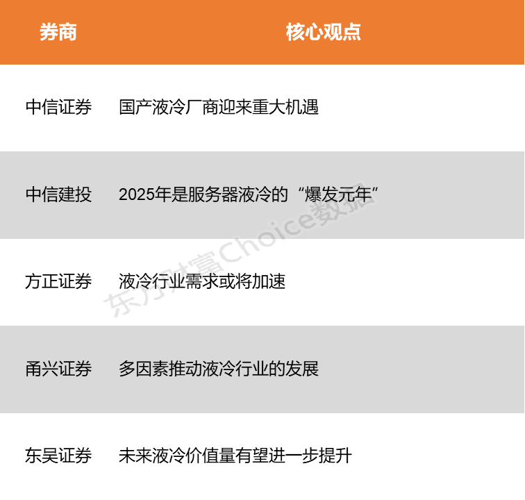 中信证券表示,当前液冷产业链以台系厂商为主。随着芯片厂商逐步参与液冷供应链选择,国产厂商迎来重大机遇。看好国产厂商充分受益AIDC液冷需求放量,推荐具备液冷核心组件量产能力及整体解决方案的厂商。中信建投指出,2025年是服务器液冷的“爆发元年”,新方案迭代利好国产厂商。市场预期GB300机柜第四季度大量出货,当前处于液冷零部件上量的关键时间节点。