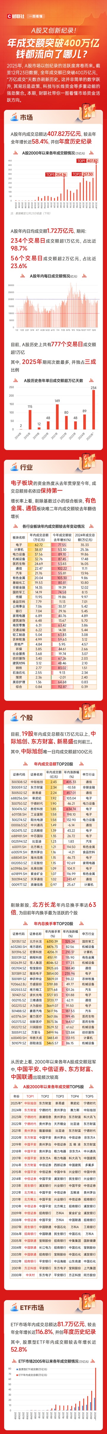 与此同时,ETF市场同样表现抢眼,全年成交总额历史首次达81.7万亿元,较去年全年大幅攀升近116.8%,同步改写年度纪录。细分领域中,股票型ETF成为资金布局的核心载体之一,年内成交额达24.4万亿元,较去年增长近52.8%,同样为年度历史新纪录。