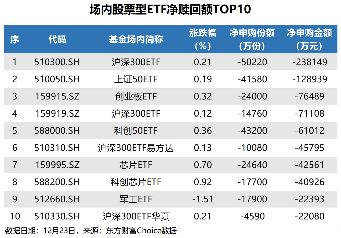 数据还显示,昨日净赎回金额最多的场内股票型ETF为沪深300ETF,净赎回金额23.81亿元;上证50ETF紧随其后,净赎回金额12.89亿元。