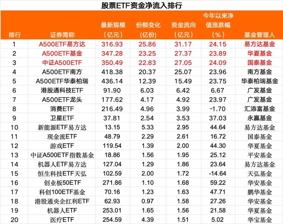 【导读】周二股票ETF资金净流入超38亿元。本周二(12月23日),A股市场窄幅震荡,三大指数集体收红,沪深两市成交约1.90万亿元。部分资金继续选择加仓。当日全市场股票ETF(含跨境ETF)资金净流入超38亿元。中证A500等宽基ETF,以及港股科技、卫星产业、机器人等行业主题ETF净流入靠前。过去5个交易日,中证A500指数相关ETF已强势“吸金”超500亿元。