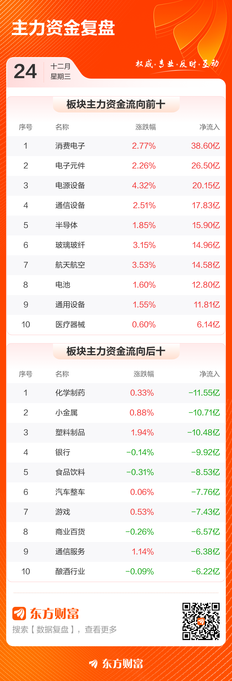 12月24日,沪指涨0.53%,深成指涨0.88%,创业板指涨0.77%。两市成交额1.88万亿,较上个交易日缩量196亿。数据显示,今日大盘主力资金净流入53.35亿。消费电子、电子元件、电源设备等板块主力资金流入排名居前,其中消费电子净流入38.60亿元。