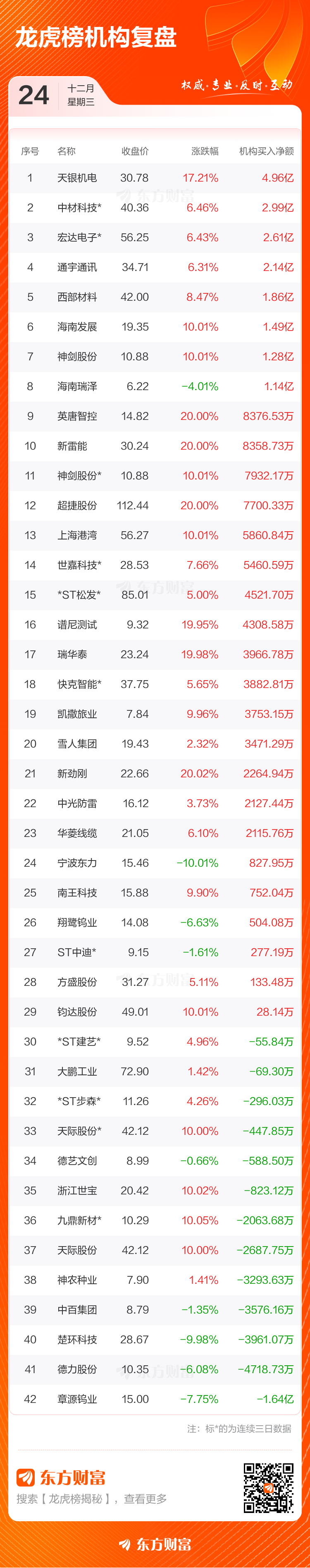 12月24日共有67只个股(含1只可转债)上榜龙虎榜,总上榜成交额240.53亿元。上榜个股中净买入额最高的是天银机电,金额为3.44亿元。