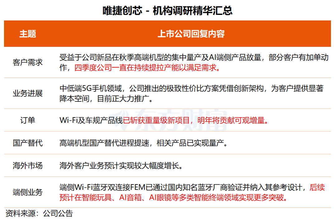 在调研中,唯捷创芯表示,受益于公司新品在秋季高端机型的集中量产及AI端侧产品放量,部分客户反而有加单动作,四季度公司一直在持续提拉产能以满足需求。