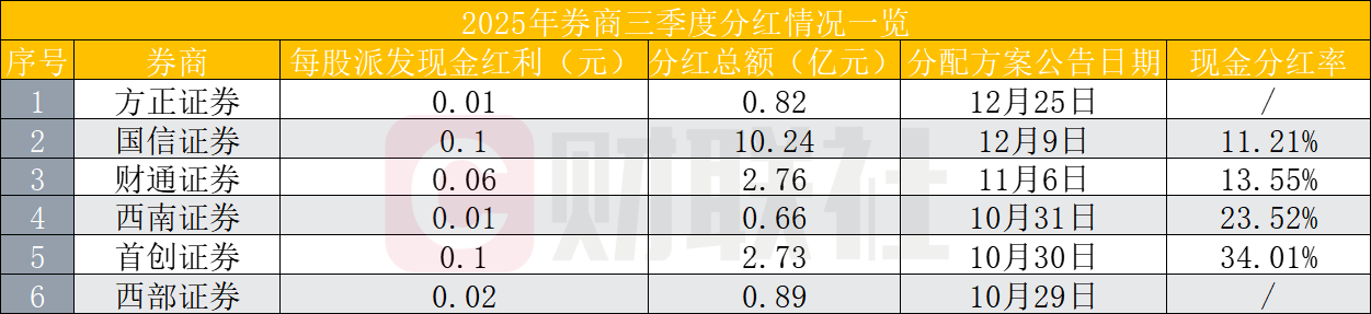 据记者梳理公告统计,截至目前,已有方正证券、国信证券、财通证券、西南证券、首创证券、西部证券等6家券商相继发布2025年前三季度利润分配方案,合计派发现金红利达17.28亿元。