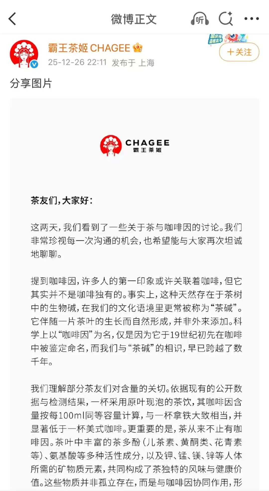 霸王茶姬股价大跌 咖啡因争议引关注