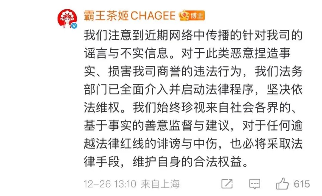 北京时间12月26日晚间,美股开盘后,霸王茶姬股价大跌,一度跌超14%,股价创上市以来新低。但截至发稿,跌幅已有所收窄。近日,“霸王茶姬咖啡因”话题登上微博热搜,引发广泛关注。有网友反映,饮用后出现了心悸、失眠等反应。对此,霸王茶姬官方微博回应称,依据现有公开数据与检测结果,其茶饮的咖啡因含量与一杯拿铁相当,但显著低于美式咖啡。此外,公司今年推出的“轻因·伯牙绝弦”系列饮品,咖啡因含量降低了约50%。对于恶意捏造事实、损害公司商誉的违法行为,公司法务部门已全面介入并启动法律程序。11月28日晚间,霸王茶姬公布了2025年第三季度财报,显示全球门店数达7338家,总GMV达79.30亿元,净收入32.08亿元,经调整后净利润5.03亿元。公司已实现连续11个季度盈利。