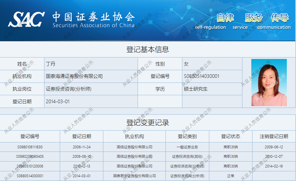 中证协官网资料显示,2010年12月,丁丹在国信证券登记为证券投资咨询(分析师),2014年2月离职注销。2014年3月至今,丁丹执业机构登记为国泰君安证券,登记类别为证券投资咨询(分析师)。