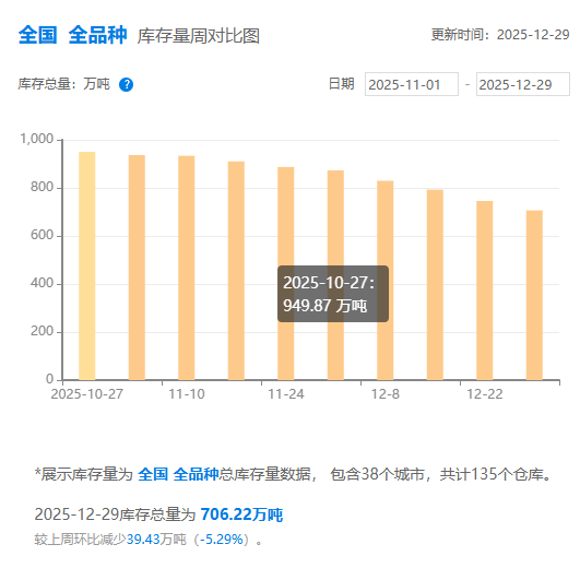 钢银电商最新数据显示,截至12月29日的一周,全国38个城市,共计135个仓库城市钢材总库存量为706.22万吨,较上周环比减少39.43万吨,降幅5.29%。其中,本周建筑钢材库存总量为311.63万吨,较上周环比减少27.70万吨(-8.16%),包含30个城市,共计79个仓库。热卷库存总量为199.29万吨,较上周环比减少6.01万吨(-2.93%),包含15个城市,共计47个仓库。中厚板库存总量71.28万吨,较上周环比减少4.20万吨(-5.56%),包含9个城市,共计14个仓库。冷轧涂镀库存总量为124.02万吨,较上周环比减少1.52万吨(-1.21%),包含5个城市,共计14个仓库。