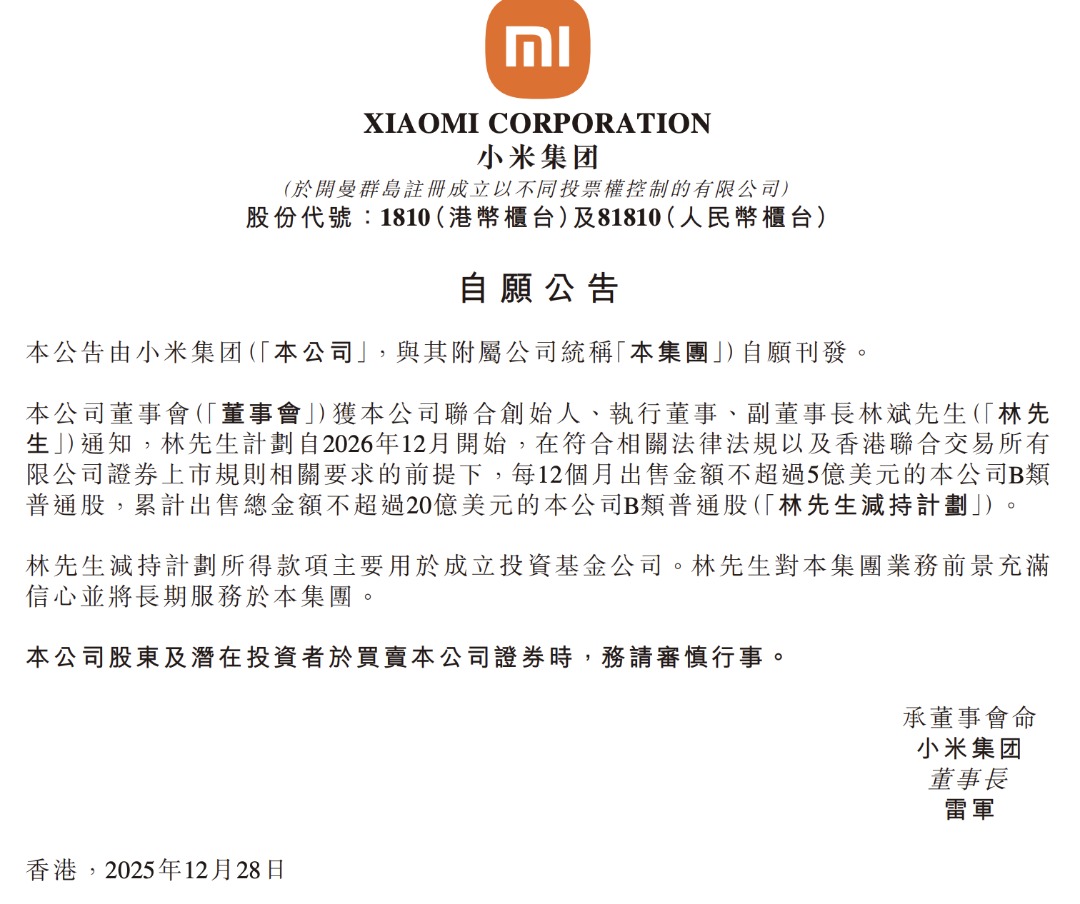 12月28日晚间,小米集团在港交所发布公告称,公司联合创始人、执行董事、副董事长林斌计划自2026年12月开始,每12个月出售金额不超过5亿美元的公司B类普通股,累计出售总金额不超过20亿美元。公告强调,减持计划所得款项主要用于成立投资基金公司。林斌表示对小米集团业务前景充满信心并将长期服务于小米集团。