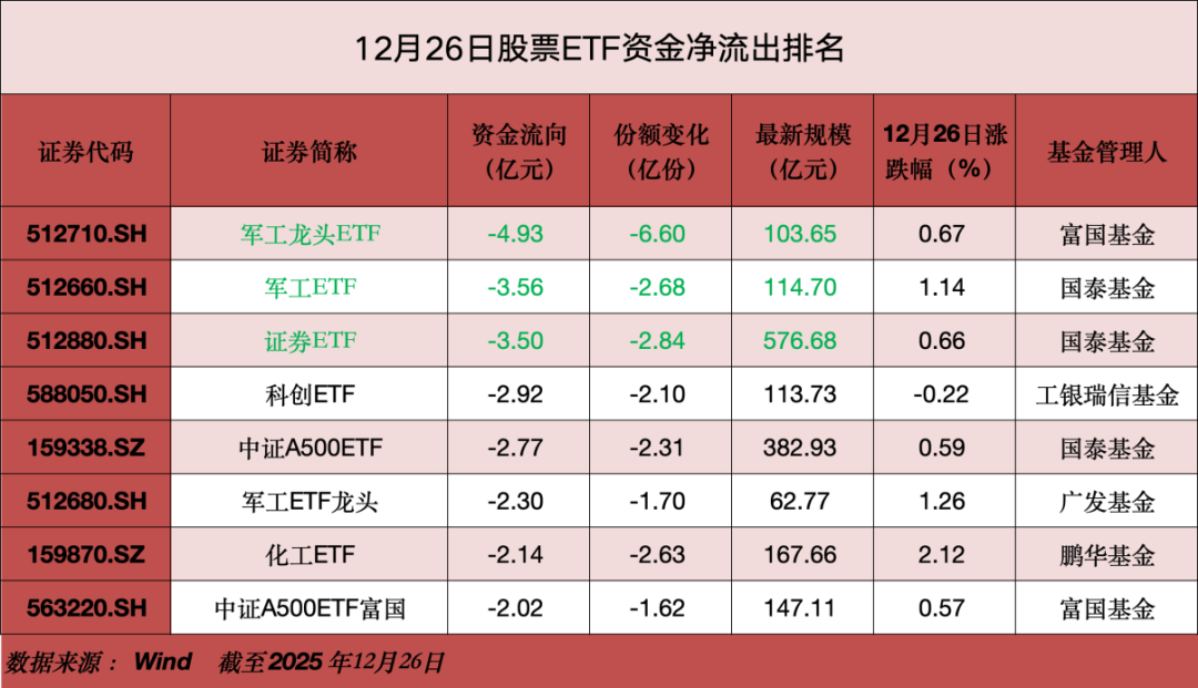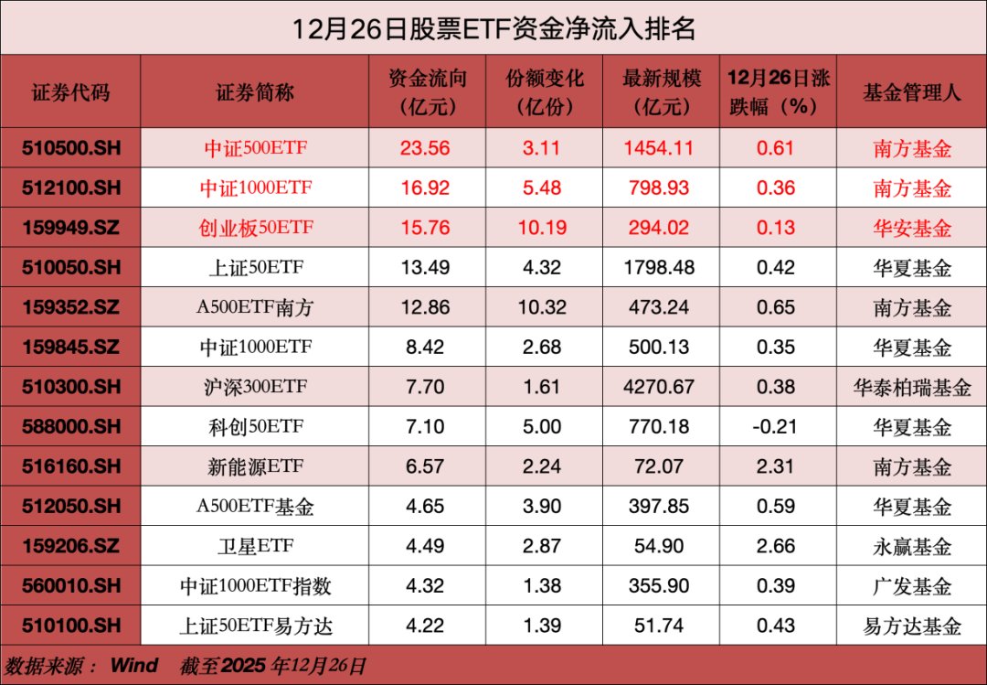 华夏基金ETF方面,12月26日,旗下科创50ETF和A500ETF基金分别净流入7.1亿元和4.65亿元;沪深300ETF华夏净流入2.23亿元,同样位居前列。