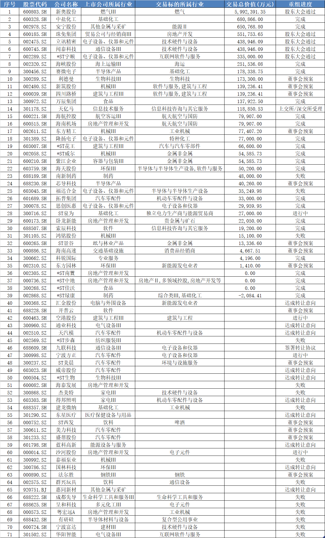 据界面新闻记者按首次披露日期不完全统计:自年初至今A股上市公司共计披露并购重组事件数量达2377条;重大重组事件数量达71条。