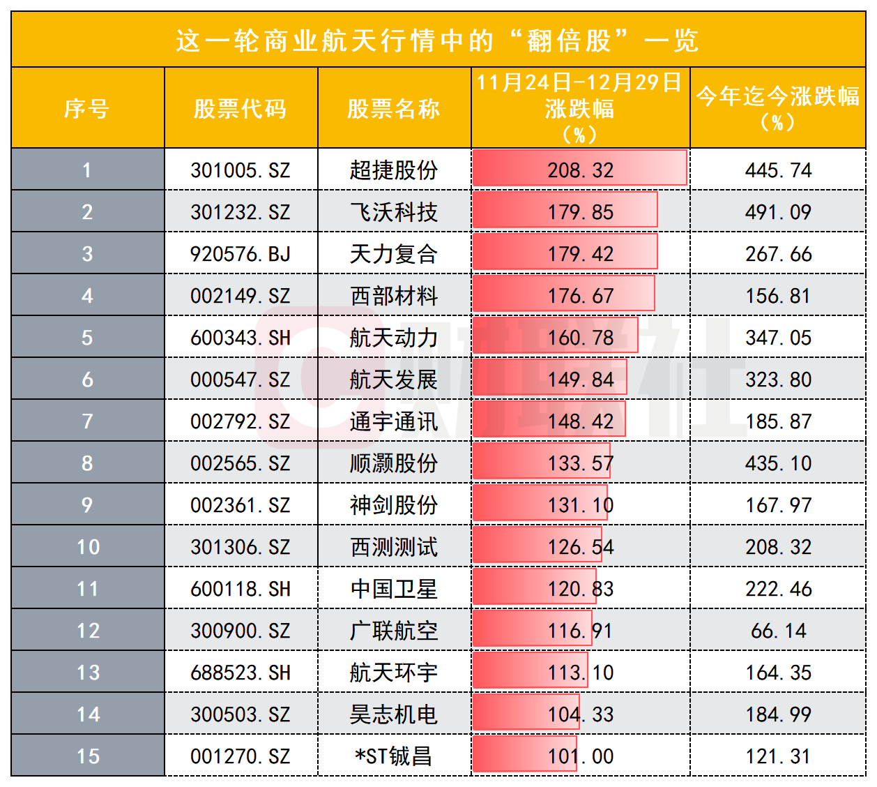 值得注意的是,这轮商业航天板块的整体行情始于11月24日,截至今日收盘,板块已有15只个股股价翻倍,其中,超捷股份大涨超208%,成为板块内最亮眼的存在。