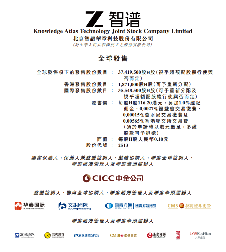智谱华章科技股份有限公司在港交所公告,在港上市拟发行37,419,500股H股(视乎发售量调整权及超额配股权行使与否而定),定价116.2港元/股。预期H股将在明年1月8日开始交易。