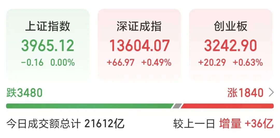 今日,A股市场午后震荡拉升。截至收盘,上证指数微跌0.16点,实现日线“十连阳”,创下今年以来最长连阳纪录,深证成指涨0.49%,创业板指涨0.63%。市场全天成交额超2.16万亿元。