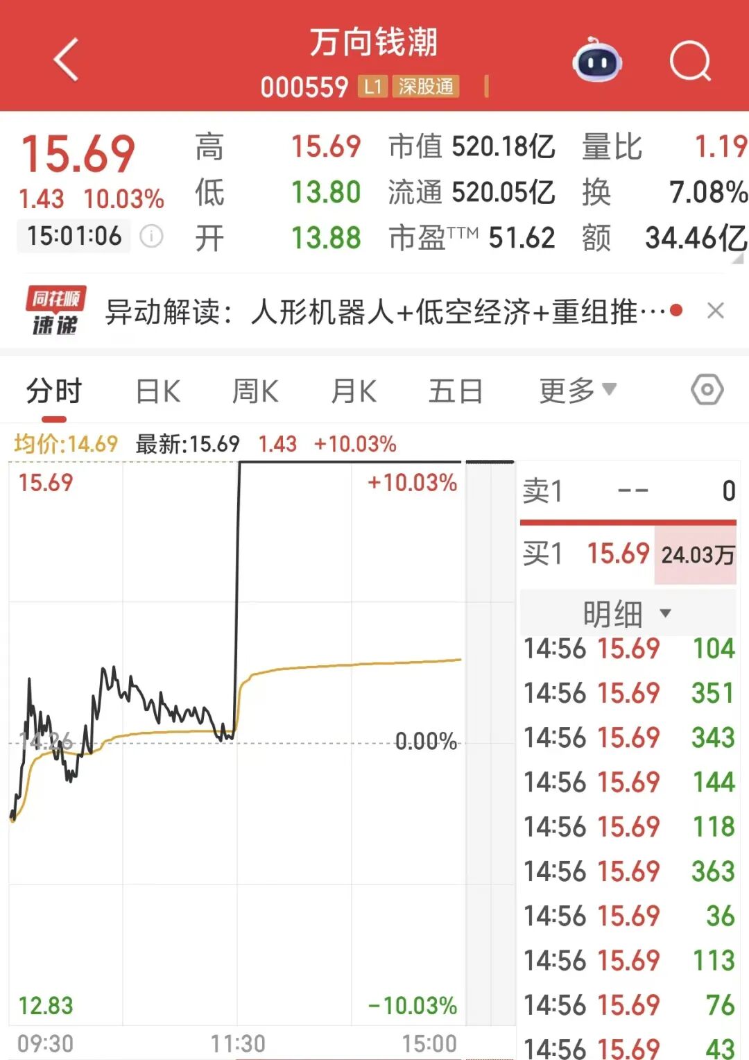 今日午后,人形机器人概念持续上涨。午后开盘,万向钱潮直线拉升,1分钟涨停;三花智控涨停,成交额超141亿元。机器人概念走强,带动产业链核心配套的PEEK材料概念同步走高,长盈精密涨超9%。