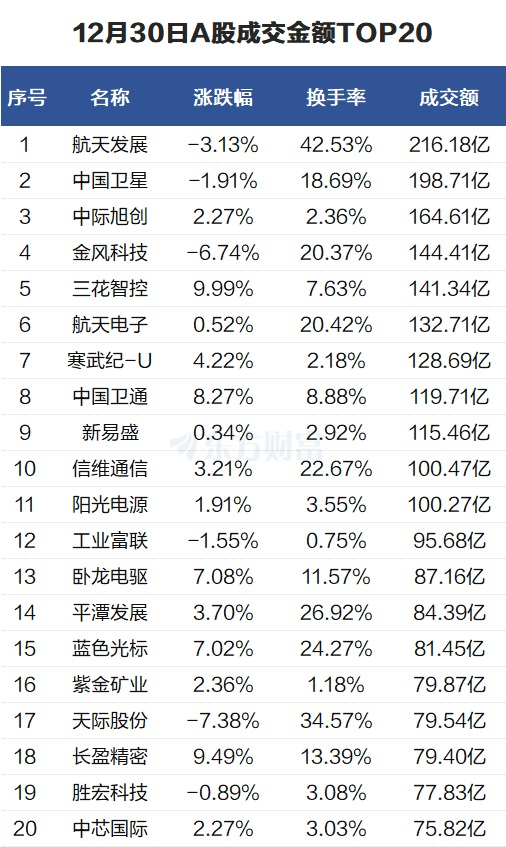 沪深两市成交额2.14万亿元,较上一交易日放量33亿元。个股方面,航天发展当日成交216.18亿元。中国卫星当日成交198.71亿元。