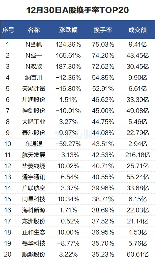 当天换手率最高的个股为N誉帆,全天换手率75.03%。N强一紧随其后,全天换手率74.2%。