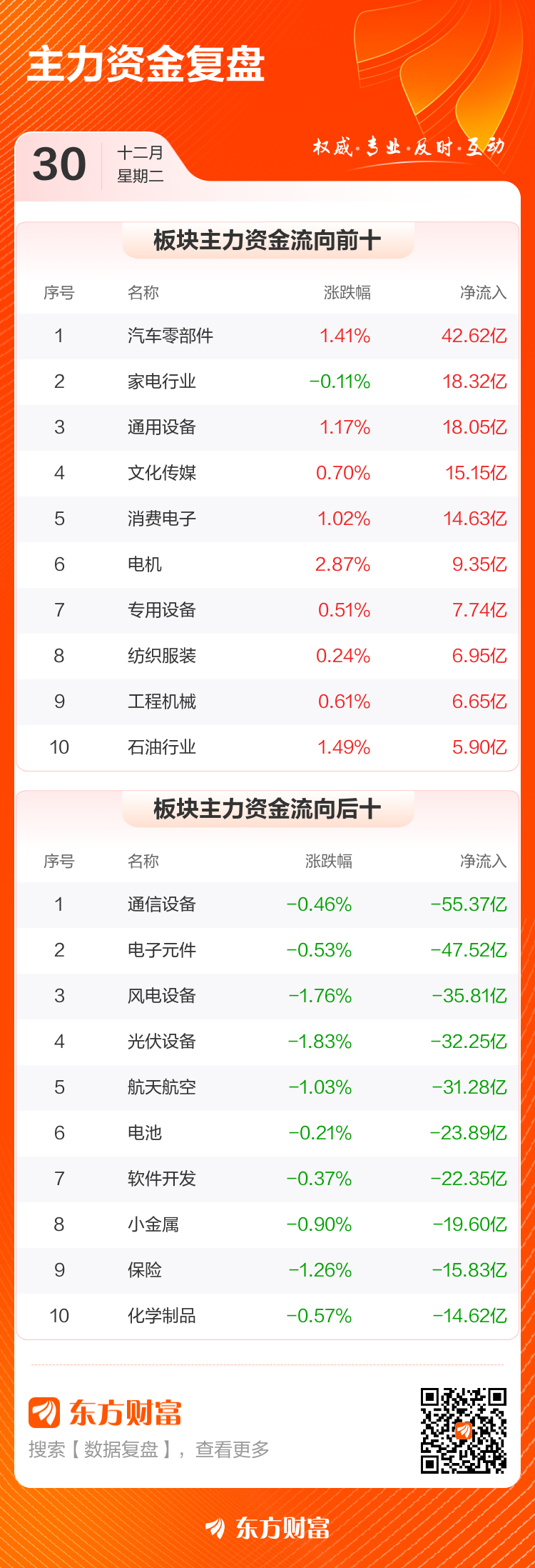 12月30日,沪指涨0%,深成指涨0.49%,创业板指涨0.63%。两市成交额2.14万亿,较上个交易日放量33亿。数据显示,今日大盘主力资金净流出387.72亿。汽车零部件、家电行业、通用设备等板块主力资金流入排名居前,其中汽车零部件净流入42.62亿元。