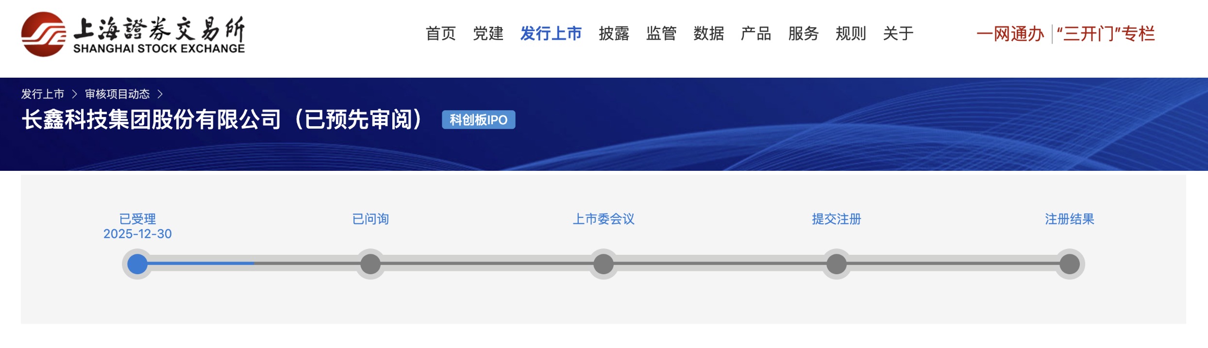 上交所官网12月30日晚间显示,长鑫科技集团股份有限公司(下称“长鑫科技”)申报科创板IPO获交易所受理。