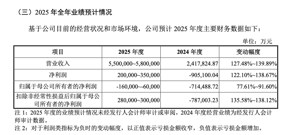 据招股书显示的全年业绩预计情况,2025年该公司预计实现净利润20亿元至35亿元,归母净利润为-16亿元至-6亿元,归母扣非净利润为28亿元至30亿元。
