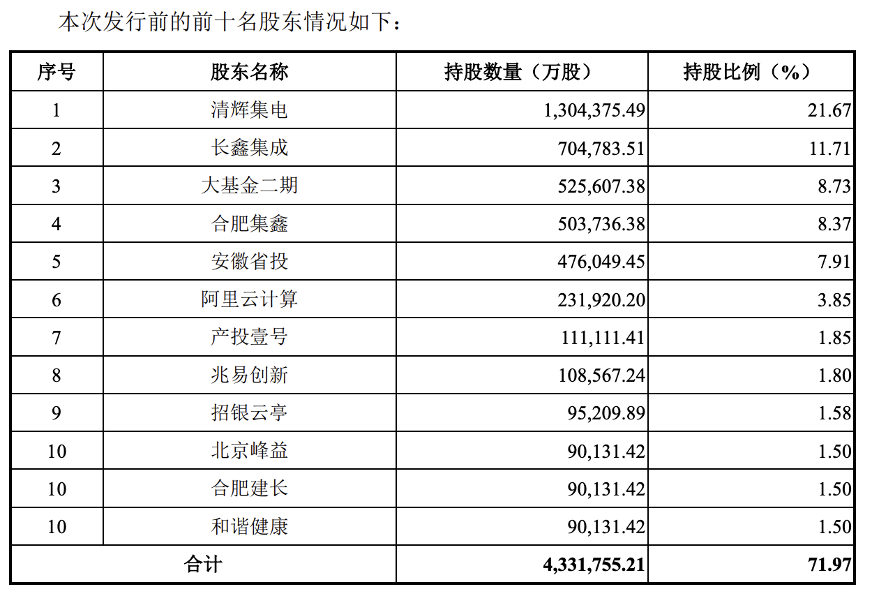 长鑫科技无控股股东、无实际控制人,清辉集电、长鑫集成、大基金二期、合肥集鑫、安徽省投分别持有该公司21.67%、11.71%、8.73%、 8.37%及7.91%的股权。