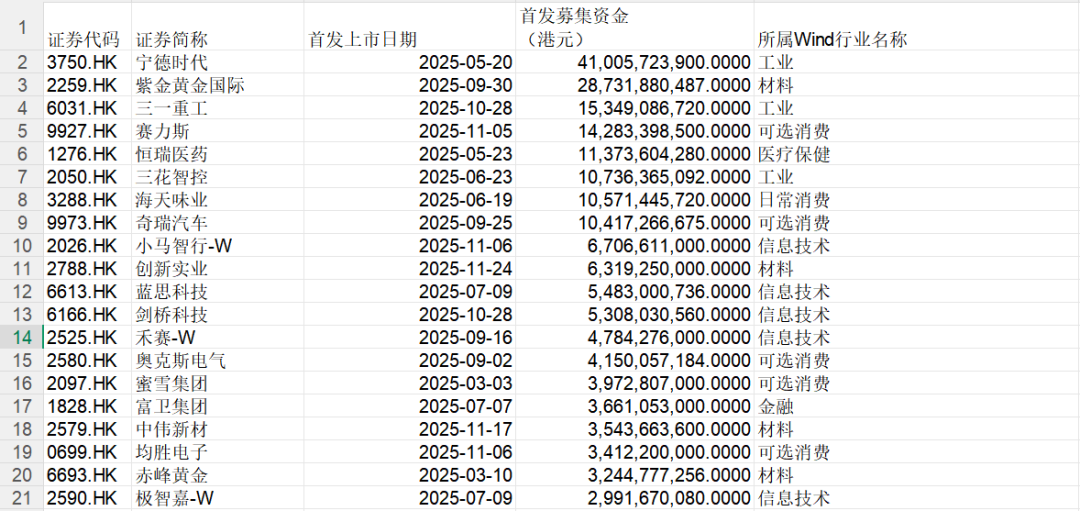 按IPO募资额计算,前十大IPO分别为宁德时代、紫金黄金国际、三一重工等。首发募资总额分别为410亿港元、287.32亿港元等。