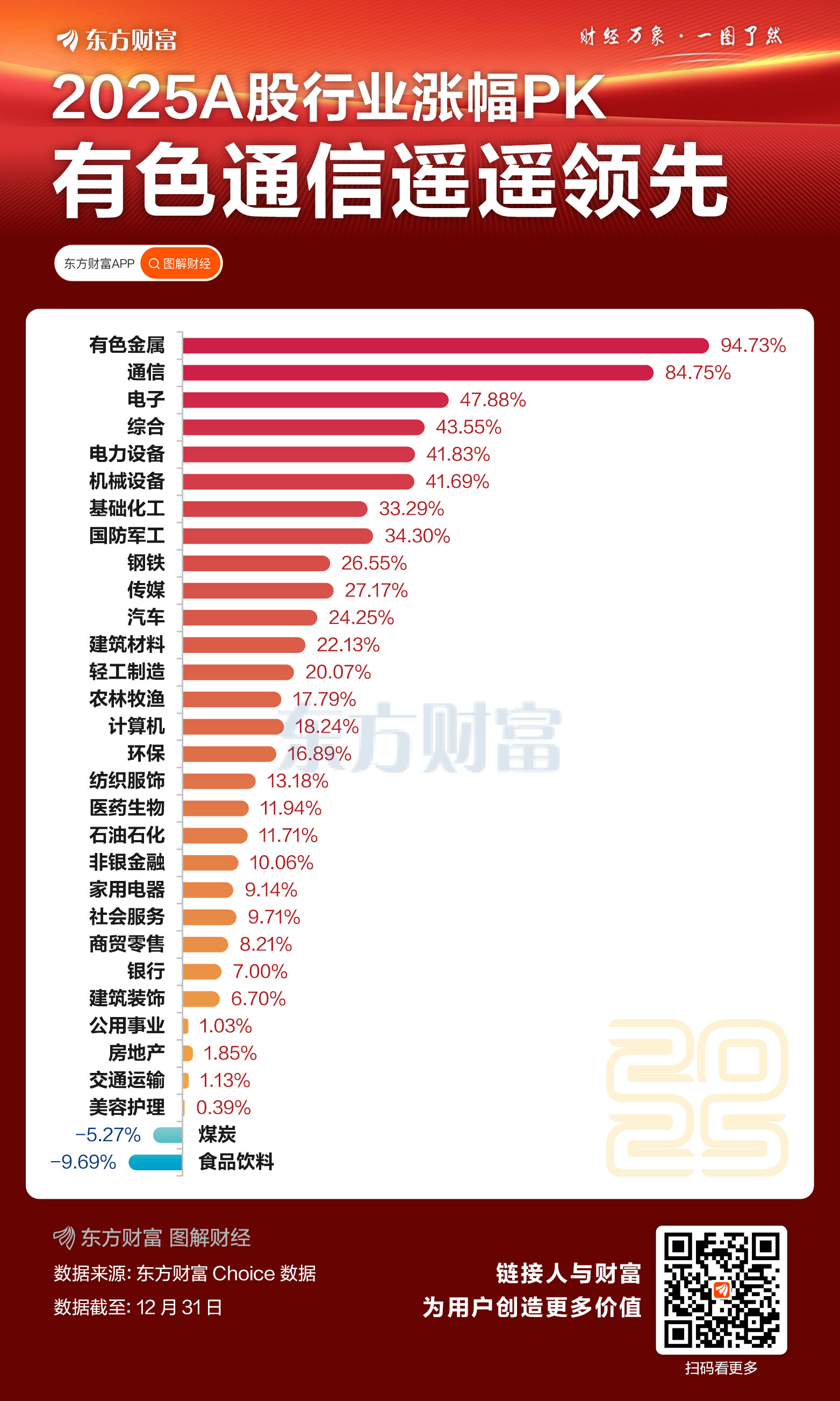 行业板块方面,今年31个申万一级行业中有29个上涨,上涨比例超93%。其中,有色金属板块涨幅最大,达94.7%,接近翻倍;通信紧随其后,今年上涨84.75%。此外,电子、综合、电力设备、机械设备、基础化工等涨幅也位居前列。