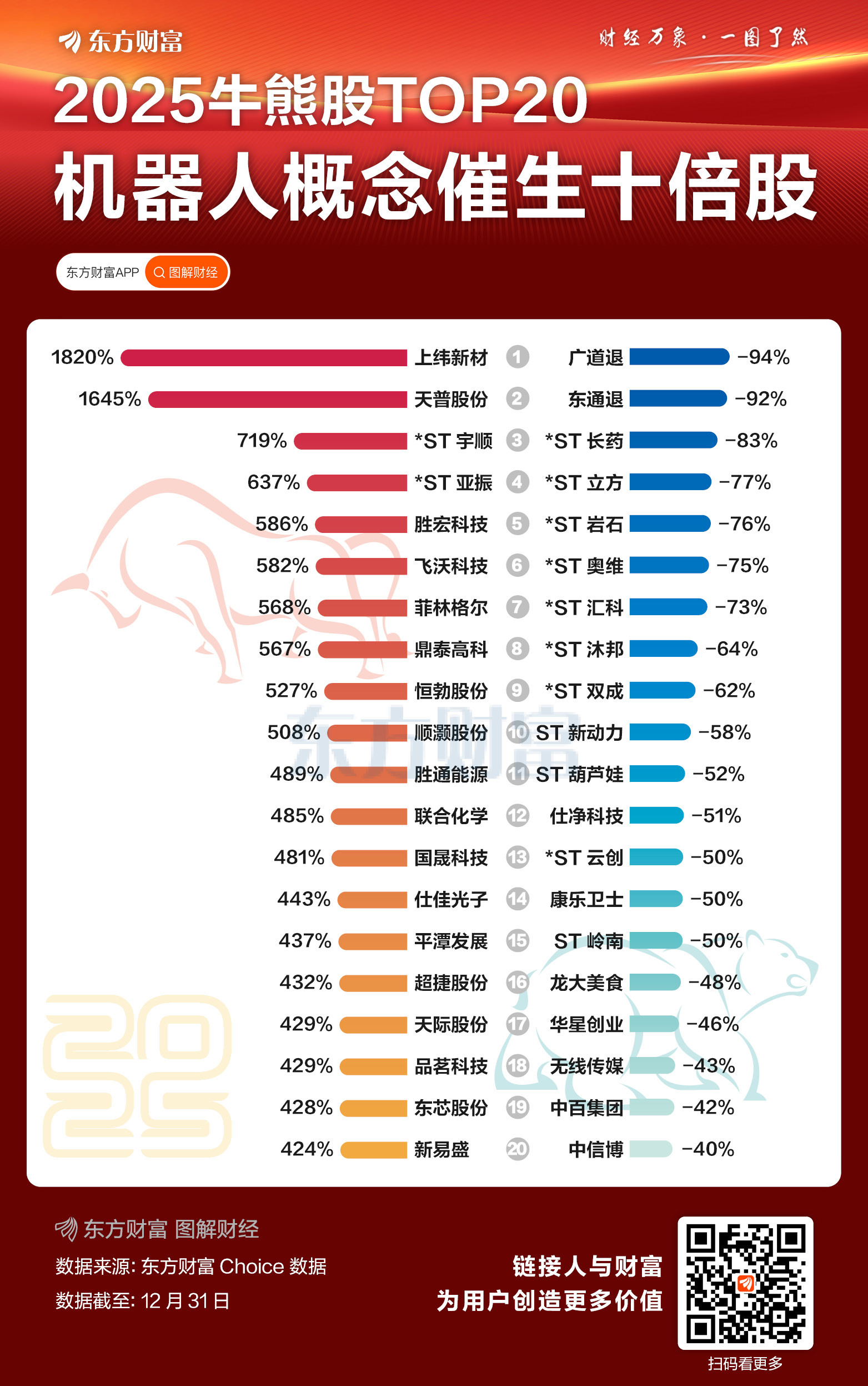 具体来看,剔除年内上市的新股后,今年A股最牛的股票是机器人概念股上纬新材,今年涨超18倍;其次是TPU概念股天普股份,涨超16倍。此外,胜宏科技、飞沃科技、菲林格尔、鼎泰高科、恒勃股份、顺灏股份等多股均涨超5倍。