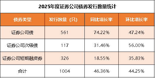2025年,流动性宽松、行业并购整合加速等因素下,证券公司债券融资呈现“量增价优”特征。市场利率低位,发债窗口吸引券商;行业并购重组加速,债务融资需求上升,成为支撑核心业务扩张的关键工具。全年券商累计发行债券1,004只,总规模突破1.89万亿元,发行数量与规模同比增幅均超44%。