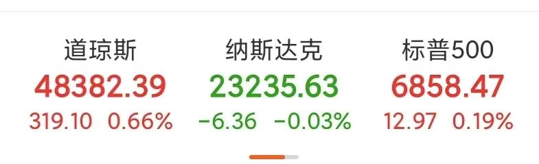 当地时间1月2日,美股迎来2026年首个交易日,截至收盘,美股三大指数涨跌互现,道琼斯指数报收48382.39点,涨幅0.66%;标普500指数报收6858.47点,涨幅为0.19%;纳斯达克指数报收23235.63点,跌幅为0.03%。